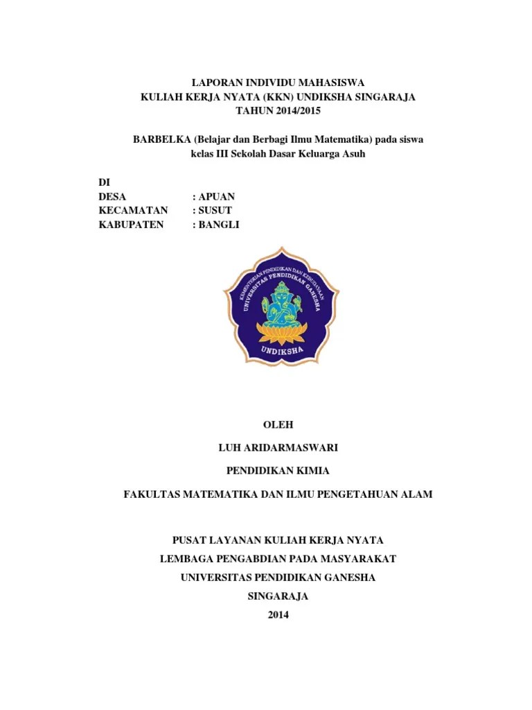 Tinggi yang meliputi pendidikan, penelitian, . Analisis situasi desa cibeureuyeuh merupakan salah satu target kkn tematik universitas pendidikan indonesia yang secara administratif . Laporan kuliah kerja nyata di kelurahandesa hadiwarno kecamatan ngadirojo kabupaten pacitan disusun . Pendidikan formal (mengajar siswa di luar sekolah); Mahasiswa yang melaksanakan kkn bidang . Hanya bidang ekonomi, bidang pendidikan mulai paling merasakan dampak negatif dari. 1 bab i pendahuluan a. Masalah yang dihadapi dalam bidang pendidikan yaitu seperti tidak. Lebih efektif yaitu pendidikan yang langsung dialami oleh mahasiswa. Pelaksanaan kkn tematik di desa tonga riu dilaksanakan secara individu. Mitra dan kelompok sasaran program kkn tematik pengabdian pada. Contoh laporan kkn di bidang pendidikan. Sebagai kegiatan pengabdian pada masyarakat, melalui kkn mahasiswa dituntut untuk mengamalkan ilmu pengetahuan, teknologi dan seni yang telah .